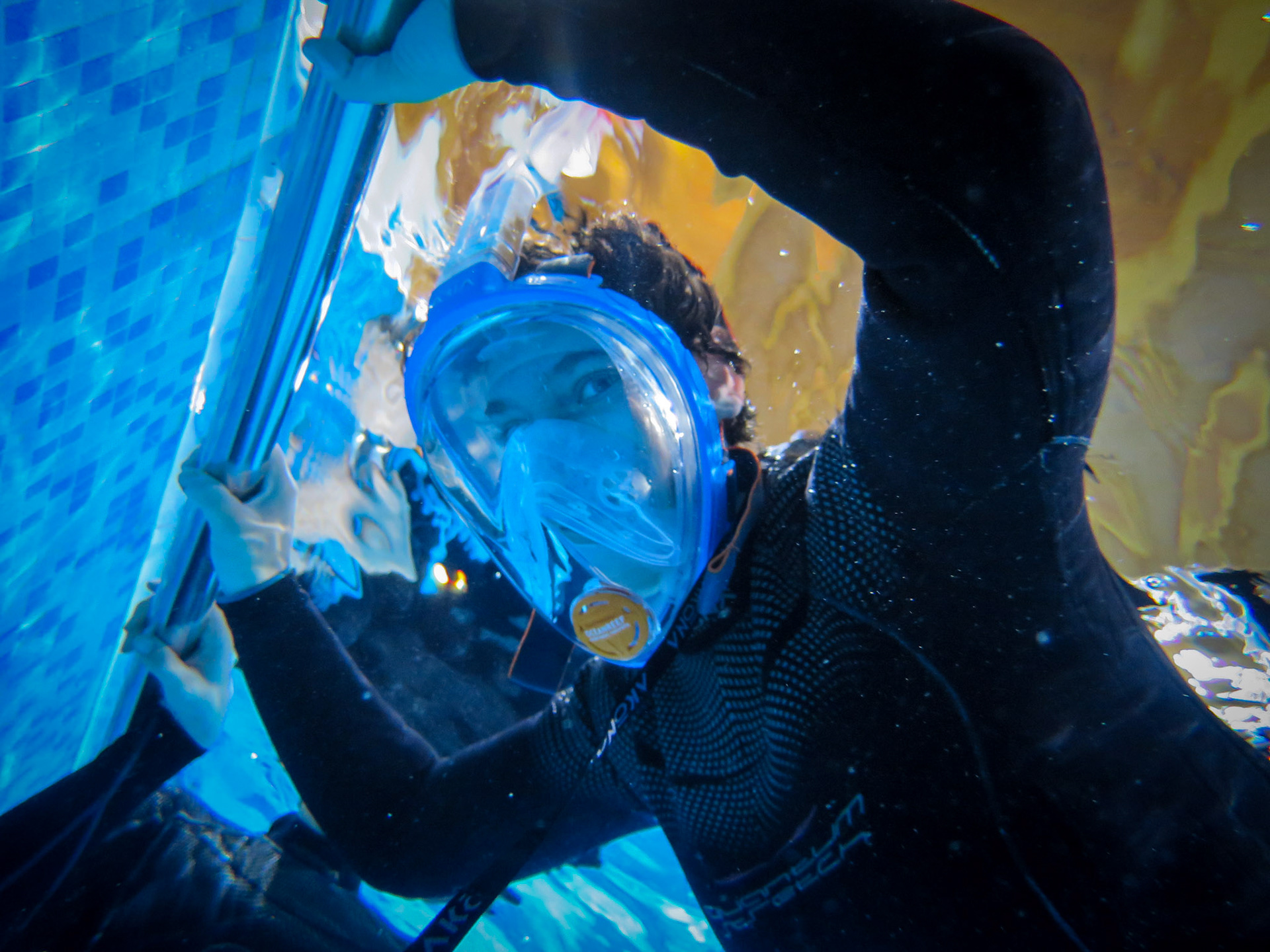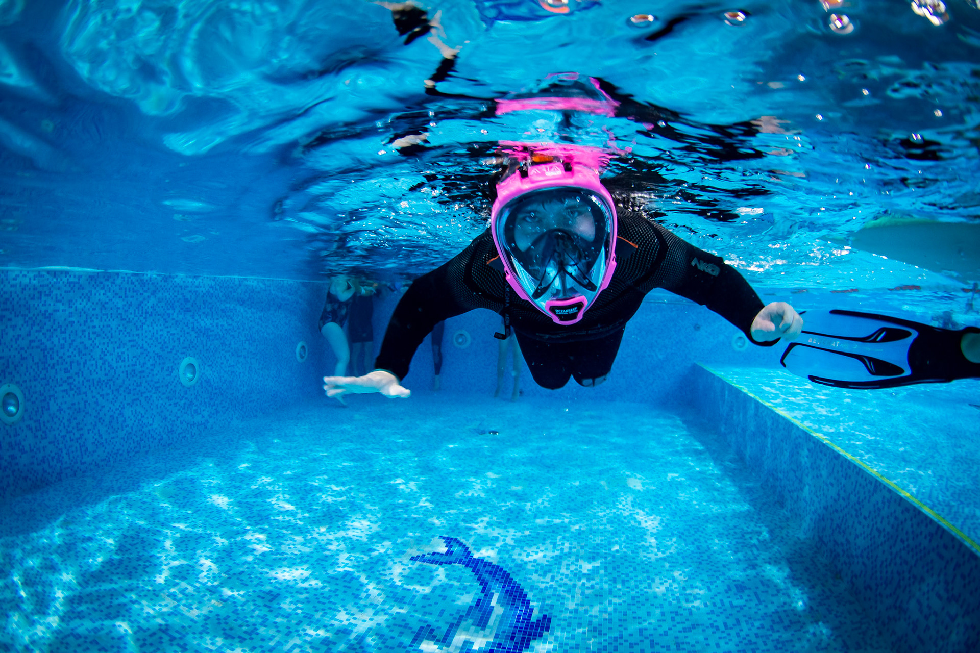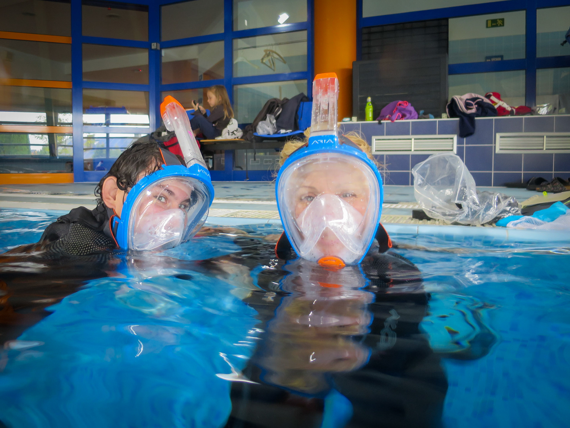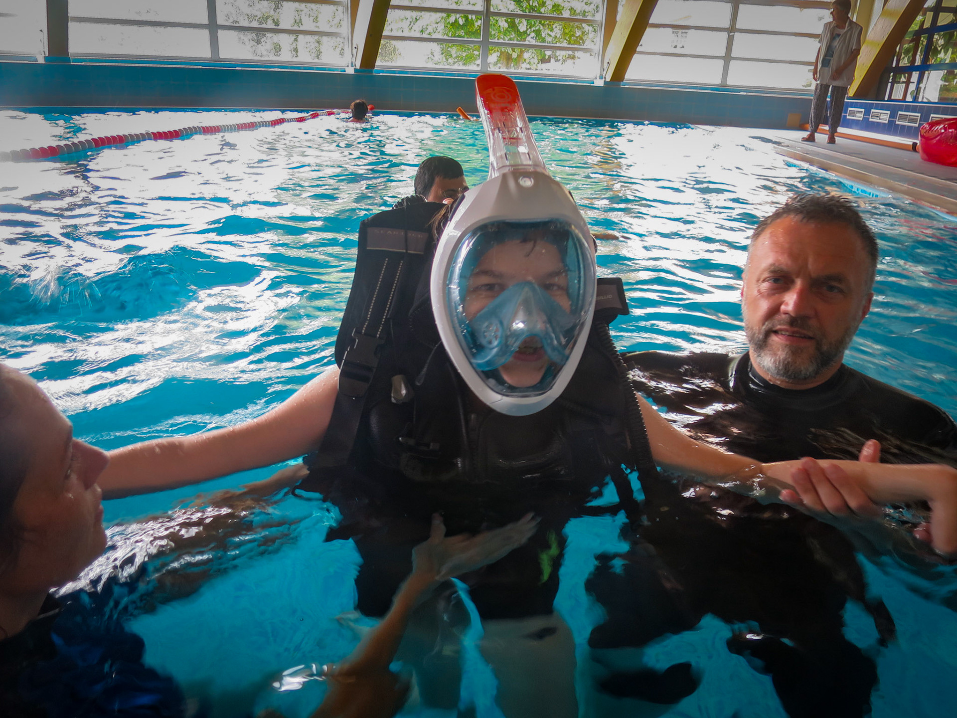 Každý náš potápěč začíná trénovat na bazénu nejprve s běžnou šnorchlovací maskou, která ho připravuje na potápění s dýchacím přístrojem. Stejný postup jako u standardního potápěčského kurzu, jen trochu pomalejší ....