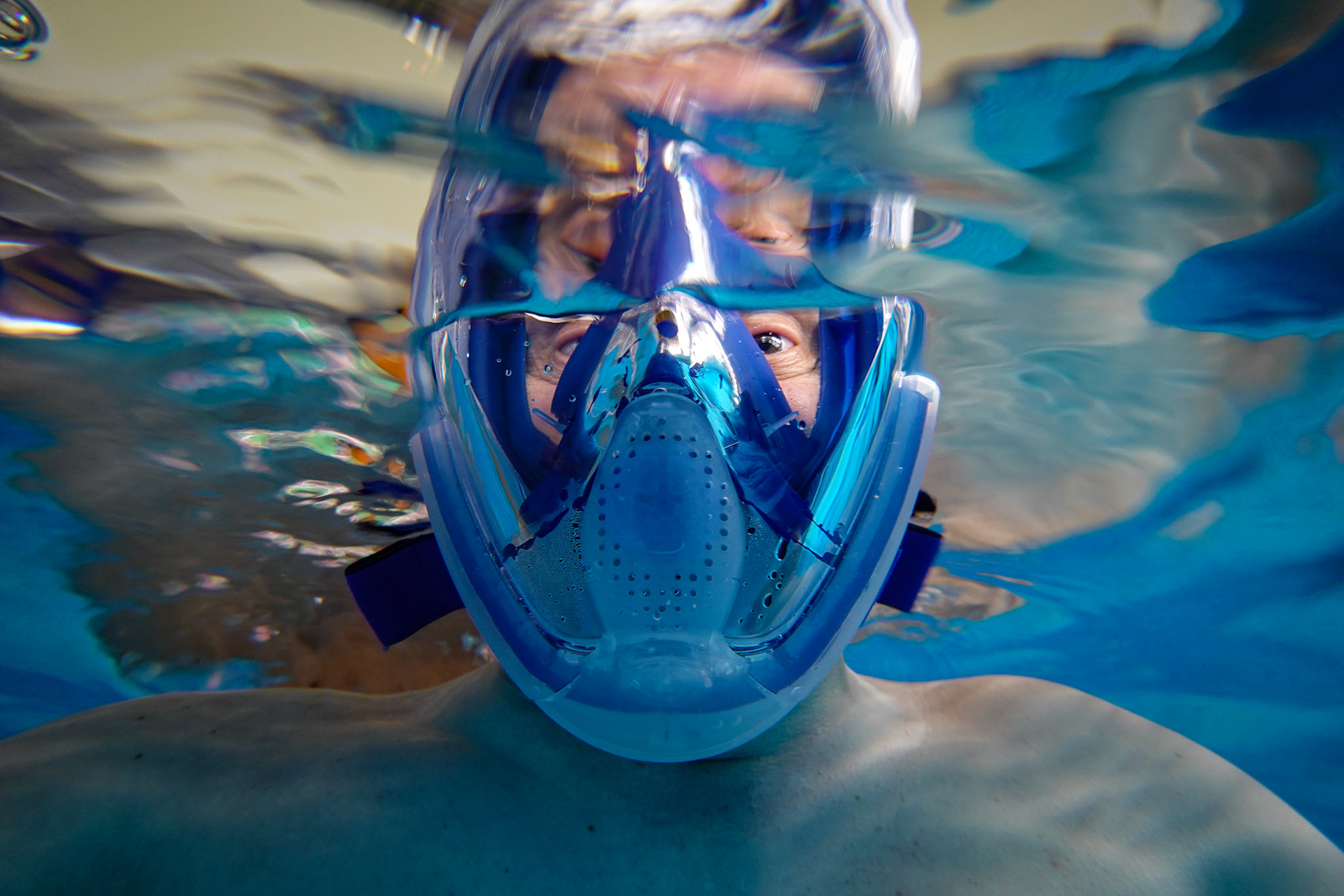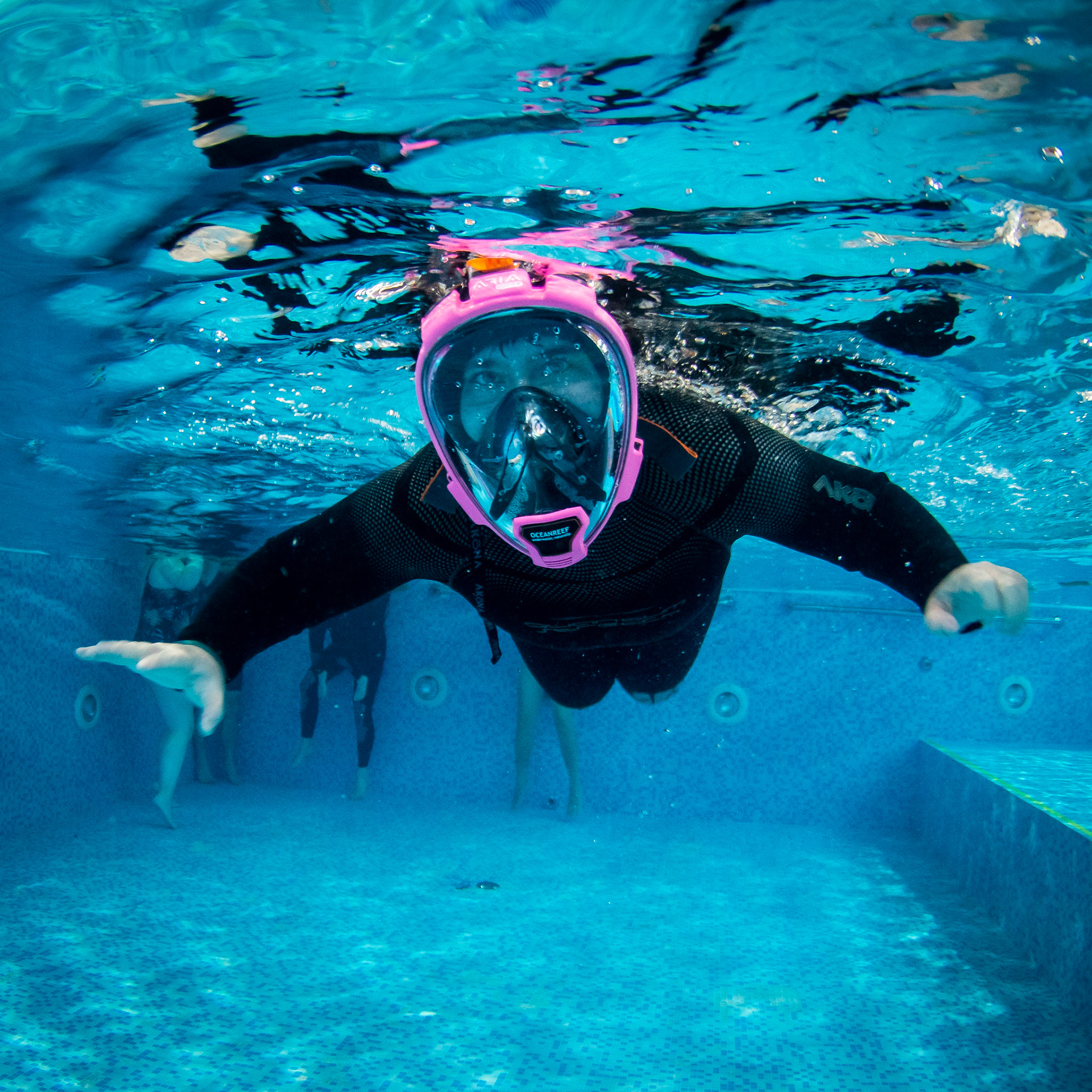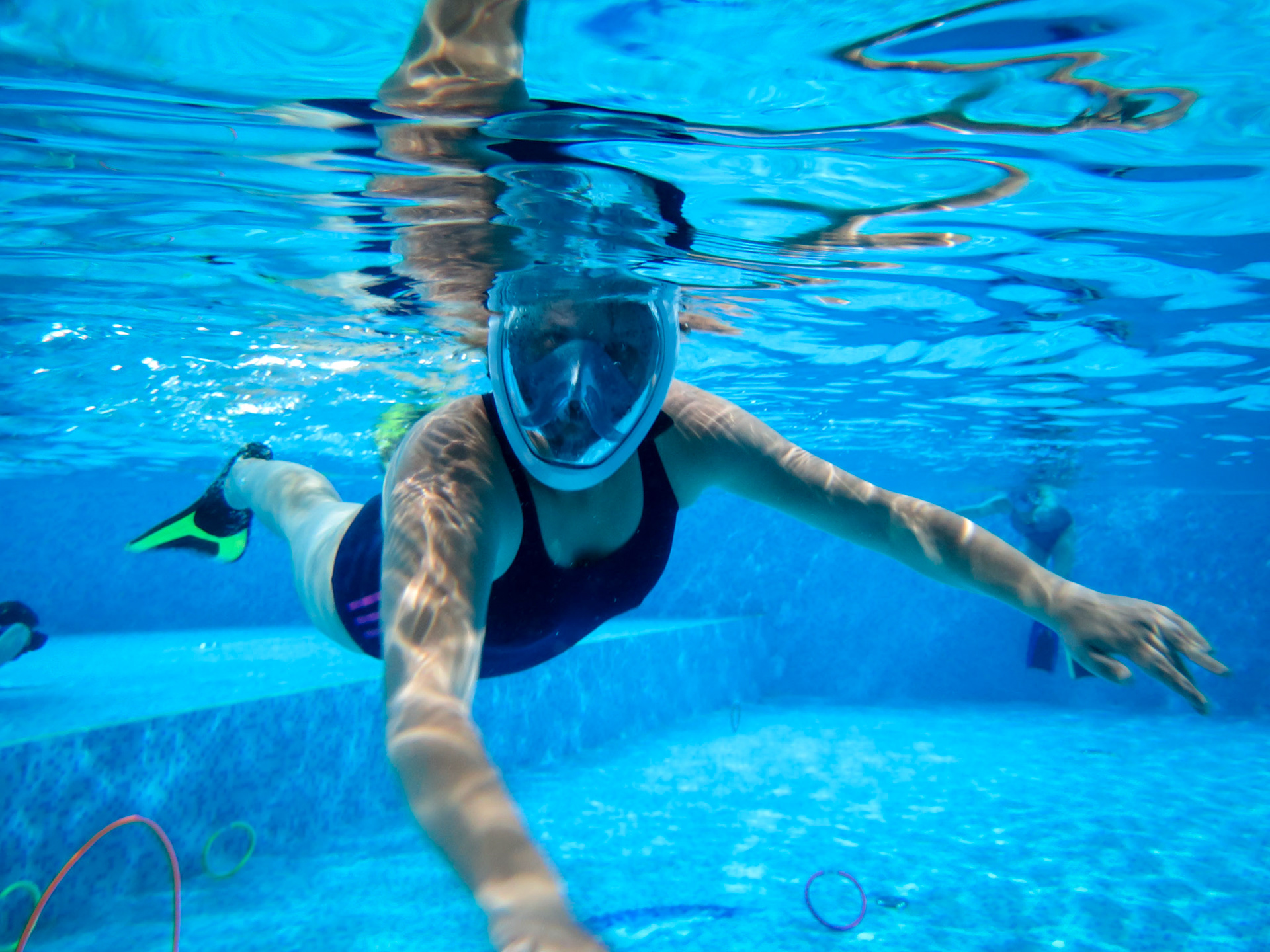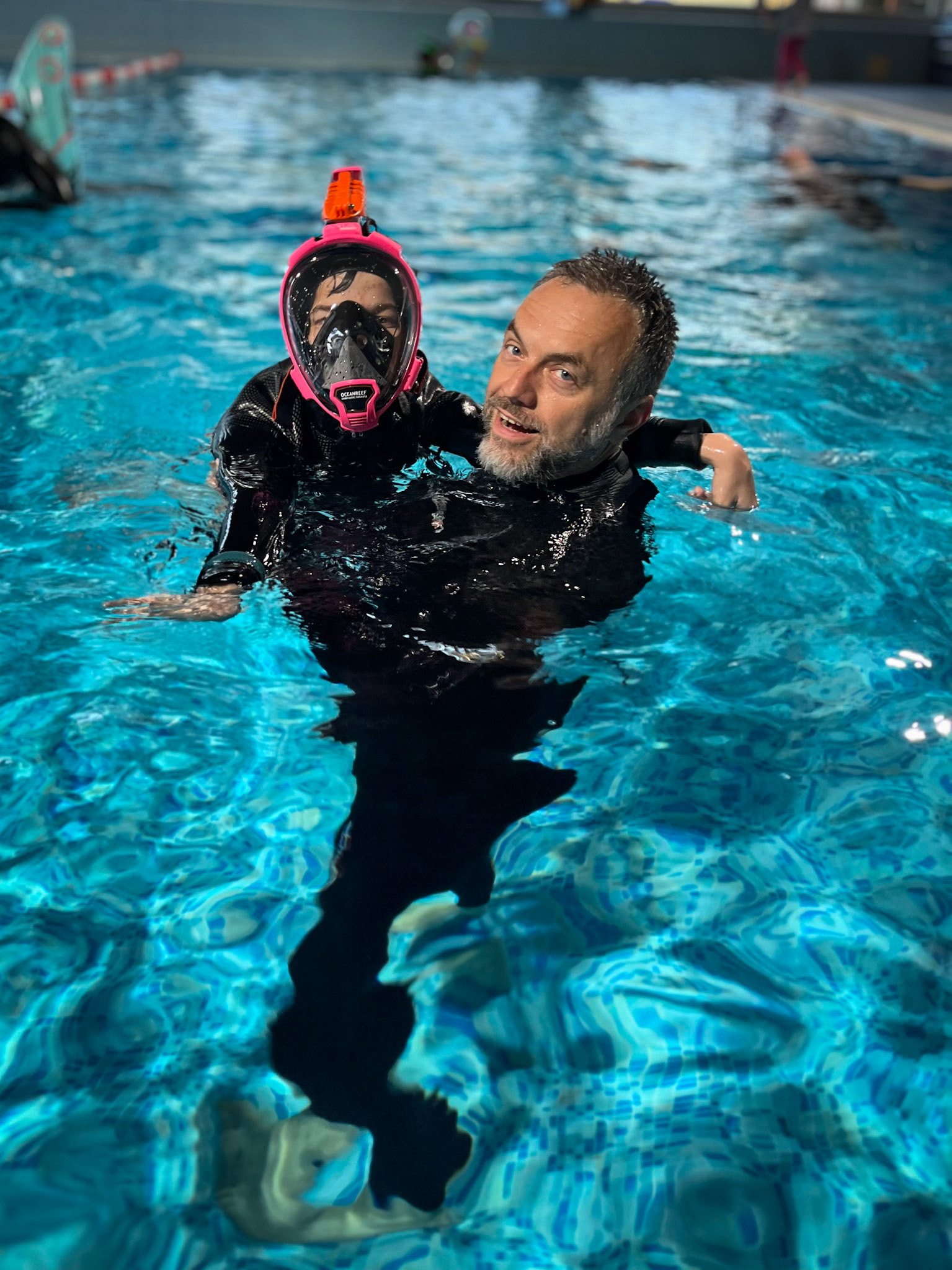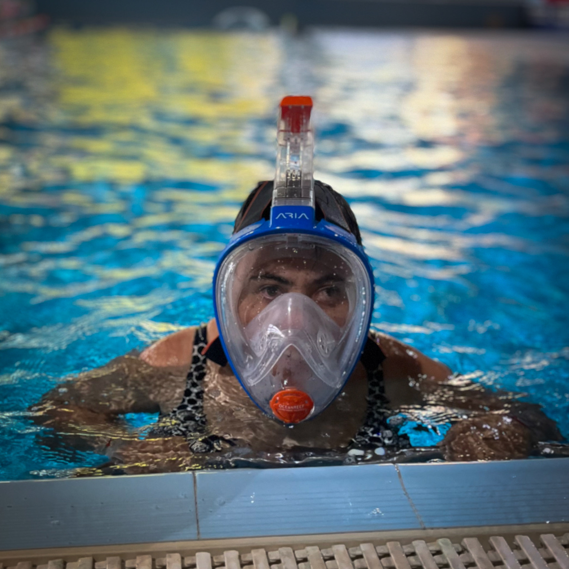 Každý náš potápěč začíná trénovat na bazénu nejprve s běžnou šnorchlovací maskou, která ho připravuje na potápění s dýchacím přístrojem. Stejný postup jako u standardního potápěčského kurzu, jen trochu pomalejší ....